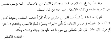 And Shaikh ul-Islaam Ibn Taymiyyah has explained the perspective from which faith, Imaan, consists of actions, and that it increases and decreases - [his discussion] needing no further elaboration - in his book 'al-Imaan'. So the one who requires more detail can refer back to it. I say: This is what I used to write for more than twenty years, affirming the madhhab of the Salaf and the aqidah of Ahl us-Sunnah - and all praise is due to Allaah - in the issues pertaining to Imaan, and then there come - in the present times - reckless ignoramuses, who are but young newcomers accusing us of Irjaa!! To Allaah is the complaint of the evil that they are upon, of ignorance, misguidance and scum..."
